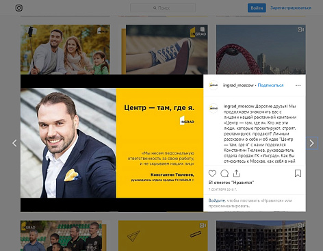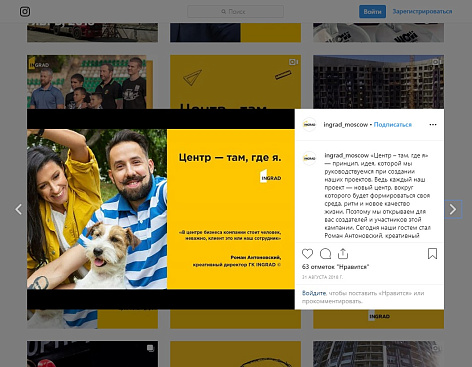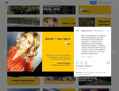 Следующим шагом стало узнавание теперь уже не самой компании, а её главных действующих лиц – сотрудников. Для новых флайтов наружной рекламы ГК «Инград» сделала две профессиональные фотосессии. Вместо ярких, но всё же чужих лиц, со щитов компании стали смотреть свои люди: менеджеры, операторы колл-центра, начальники отделов, администраторы и даже топ-менеджмент. Теперь ГК «Инград» может с полным правом сказать, что у неё есть собственное лицо. Таким образом, мы сделали героями рекламной кампании нашу собственную команду, дав лучшим сотрудникам шанс на 15 минут славы на наших рекламных щитах. С точки зрения визуализации, ГК «Инград» окончательно застолбил за собой яркий позитивный желтый цвет и живые эмоциональные фото людей, выделяющиеся на фоне рендеров проектов, которые используют на биллбордах другие девелоперы.