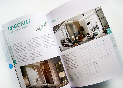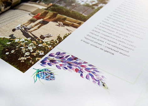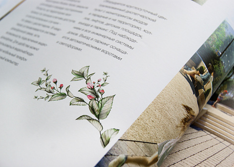 Особо стоит отметить, что «европейское» настроение буклета поддерживается заголовками на французском языке. Они стали своеобразными акцентами, выделяющими главные качественные особенности жилого комплекса. Важно и то, что заголовки, набранные гротеском, подчеркнули нежную хрупкость иллюстрированных цветочных мотивов, использованных во всем буклете.