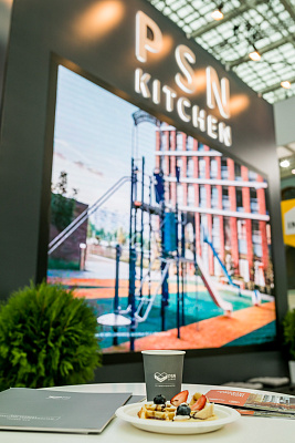 Стенд площадью 110 кв. м был оформлен в стиле кухни – PSN KITCHEN. Основной посыл идеи: «Добро пожаловать на внутреннюю кухню Группы ПСН. Мы готовы показать свои проекты и рассказать о их создании».