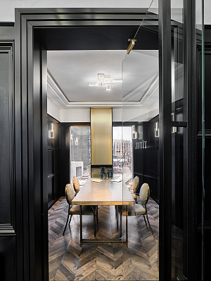 Чтобы придать интерьеру ощущение высокого класса – на ресепшен, а также в каждой переговорной мы интегрировали в стены – биокамины. Покрытие стен выполнили панелей буазери, центральные части которых выполнены из кожи.