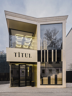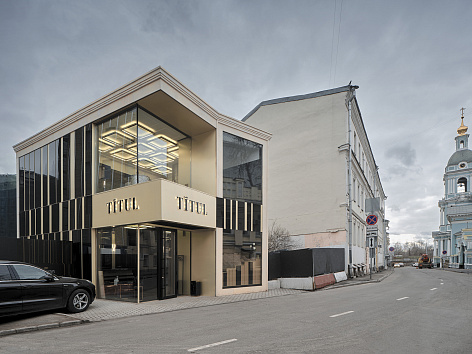 Фасадное решение видовых сторон здания содержит элементы фирменного стиля в виде «штрихкода» - вертикальные полосы из алюминиевого композита цвета золота, а также черного цвета обратнокрашенного стекла.