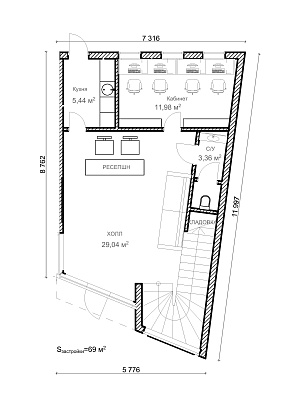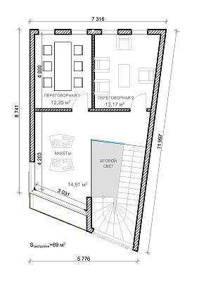 Долгий поиск архитектурных решений все же привел нас к сбалансированному и пропорциональному зданию, где первый этаж был выделен под зону ресепшен, а второй этаж включал макетный зал и две приватные переговорные.