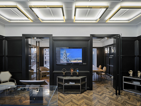 Светильники изготовили на заказ из латуни и алюминия – светящиеся «золотые» квадраты выстроены в плоскость чуть ниже уровня основного потолка, вторя такой же формы квадратам, но выполненными из гипса.