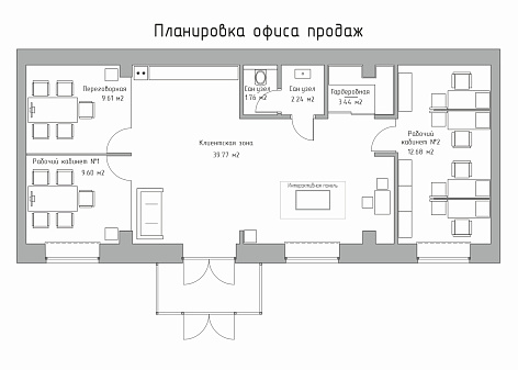 В офисе все продумано для того, чтобы помочь клиенту сделать правильный выбор: интерактивная панель для изучения планировок, приватная переговорная, отдельные кабинеты для оформления сделок, кофе и прохладительные напитки в welcome-зоне. Поскольку комплекс позиционирует себя как семейный, в офисе продаж расположен детский уголок.