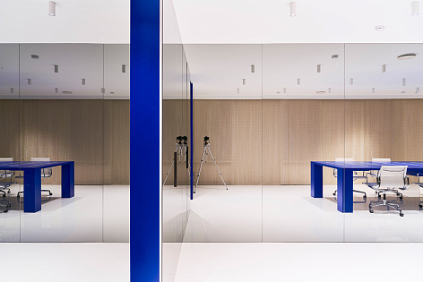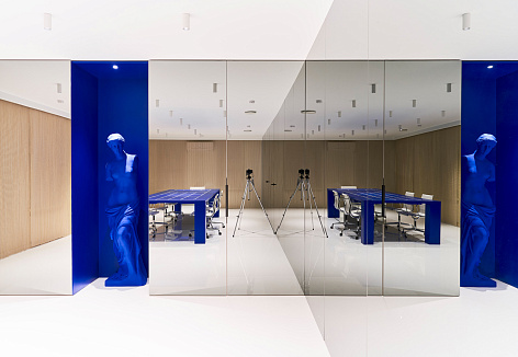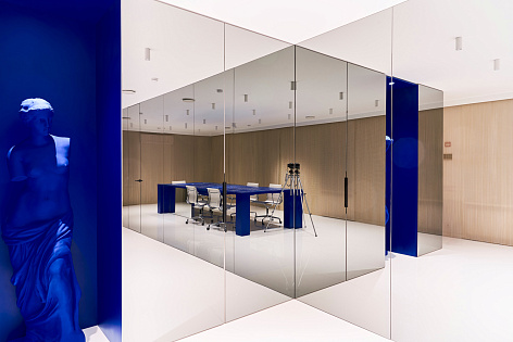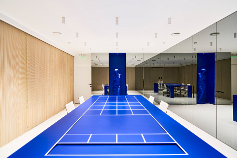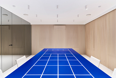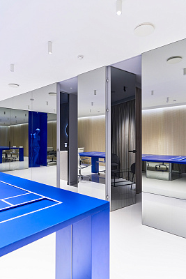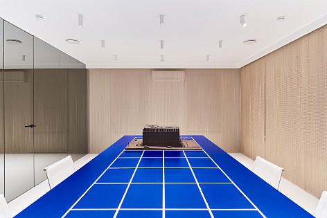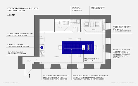 Скромная площадь продиктовала особый подход к его проектированию. Смысловым центром стал фантастический многофункциональный стол ультрамаринового цвета. Конструкция стола беспрецедентна: он состоит из многочисленных закрытых ячеек, где хранятся буклеты Fantastic House, ультрамариновый годзилла для детей и конфеты ему в цвет. Внутри скрыт особый механизм, благодаря которому макет здания появляется буквально из неоткуда во главе стола. При необходимости рядом с макетом появляется плазменный экран. Чистая и свободная поверхность стола и содержимое, скрытое от глаз, повторяют и подчеркивают концепцию Fantastic House, воплощенную в формуле, где дом — сумма всех его частей. Ничто не отвлекает от переговоров, а яркий ультрамарин будит воображение, вызывает яркие эмоции и запоминается. За зеркальной стеной скрыты подсобные помещения, камерная переговорная, кухня и бар, куда ведут специальные двери-невидимки. Противоположная стена декорирована сотнями мерцающих тонких цепей, которые одновременно украшают пространство и закрывают окна.