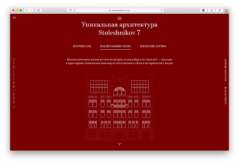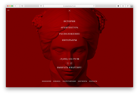 Знакомство с сайтом начинается с появления лого, символизирующего непримиримость, чемпионские амбиции и жесткий внутренний стержень потенциальных обладателей этого жилья. Далее на фоне появляется интерактивная Герма. Прием с использованием «лица» здания также был использован нами в проекте «Дом с Атлантами» и стал узнаваемым почерком девелопера. На сайте нет ничего лишнего: лаконичное меню мгновенно погружает в детали проекта. Каждый раздел — строго функционален, но полон вдохновения. Галерея рендеров специально адаптирована для просмотра с мобильных устройств без потери качества.