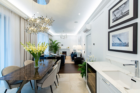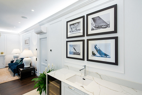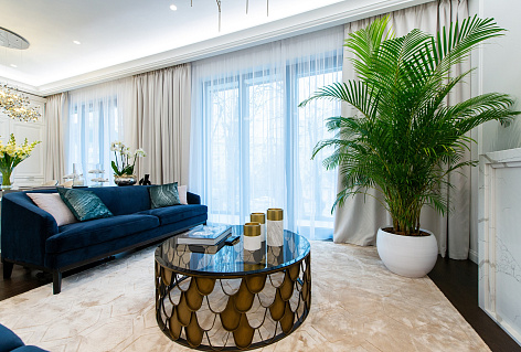 Меблировка и декорирование шоурума выполнены в последних мировых трендах: сочетание оттенков теплых и холодных металлов - латуни и хрома в мебели и декоре, черный матовый металл в аксессуарах и фурнитуре, глубокие оттенки текстиля мягкой мебели, изящная текстура искусственного и натурального камня на столешницах кухни, обеденного стола и портала камина сочетается с паттерном камня на подушках. Название проекта RiverSky находит отражение в декоре шоурума - парусная регата на постерах, «чешуя» основания журнального стола, декоративные вазы через которые проплывают рыбы и завершают образ большие настольные светильники с рельефом речных волн и рыбками.