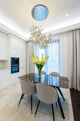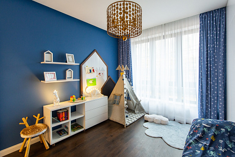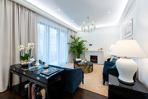 В шоуруме представлены все удачные планировочные решения и фишки, которые проповедует наша команда - множество комфортных зон хранения от встроенных шкафов до гардеробных комнат, зонирование квартиры на общественную и приватную зону, объединенная общая зона, состоящая из кухни, столовой и гостиной, камин (в шоуруме электрический, в реальных квартирах можно установить настоящий дровяной камин), большой санузел с отдельно стоящей ванной и панорамным окном. Максимальный комфорт для наших клиентов предоставит система умного дома под управлением приложения или через Яндекс-станцию Алиса. «Умный дом» позволяет управлять освещением, климатом, системами безопасности и мультимедиа контентом.