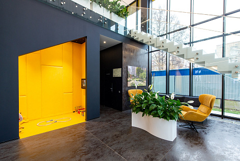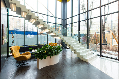 Офис погружен в освежающую зелень высоких деревьев, полноформатное остекление позволяет создает полную иллюзию близости дикой природы в самом центре Москвы. Ощутите себя в реликтовом лесу, даже не покидая помещения.