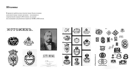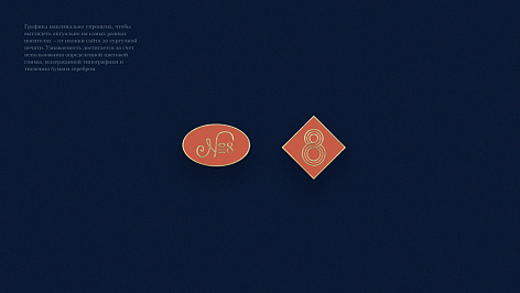 Идея знака опирается на эстетику архитектурных деталей дома, а номер дома, восьмерка вплетается в литеру «П», напоминая символ бесконечности. Графика максимально упрощена, чтобы выглядеть актуально на самых разных носителях – от иконки сайта до сургучной печати. В процессе работы над стилем также были созданы дополнительные знаки-штампы – восьмерки и упрощенный портрета Истомина, с ориентиром на документами и вывески XVIII и XIX веков. Узнаваемость достигается за счет использования определенной цветовой гаммы, выдержанной типографики и тиснения бумаги серебром.
