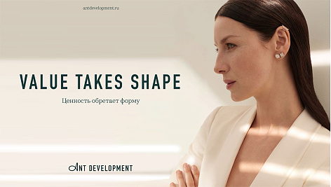 выраженного в миссии “Устремляясь в будущее, но почитая традиции, ANT Development создает объекты, воплощающие подлинную ценность премиальной жизни”, агентством также был предложен аутентичный слоган – «Ценность обретает форму». Международный статус компании требовал также разработки английской версии бренд-коммуникации, так появился дополнительный слоган “Value takes shape”.