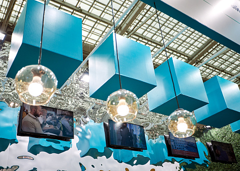Составные элементы: Напольное покрытие, стены, фриз, подвесные кубы, картины для оформления стен, стойки ресепшен с подсветкой, световое оборудование,tv панели, декоративные подвесные светильники,