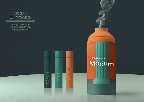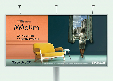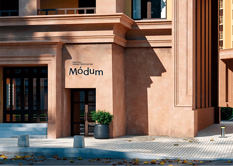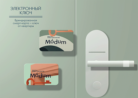 Название MODUM (от лат. modus) — мера, образ — конструирует неологизм, напоминающий о таких словах, как «дом» и «модный». Мы забрендировали все точки контакта с брендом: от электронного ключа, до офиса продаж и формы персонала сервисных служб. Мы создали впечатление, как будто вы пользуетесь инфраструктурой первоклассного отеля, каждый день «открывая перспективы», но неизменно попадаете к себе домой.