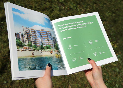 Буклет получился легким для восприятия: минимум текста и много атмосферной авторской инфографики. Контрастный фотостиль погружает вас в ощущения желанного отпуска. Особое настроение придают рендеры, которые были созданы в ходе проекта с акцентом на детали: пляжные зонты, летние закаты и лодки. А еще вы можете порисовать прямо в буклете и представить, как будет выглядеть ваша будущая планировка с мебелью.