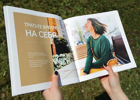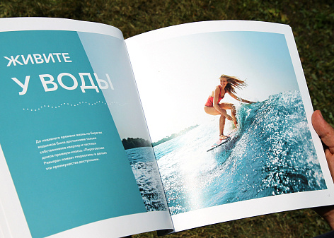 Мы использовали яркие, сочные цвета лета: бирюзовая волна, золотистый песок, сочные фрукты и зеленая трава. Формат издания — 250*250 мм, количество полос — 56 + обложка, крепление — клеевое. Обложка выполнена на мелованной матовой бумаге 300 г/м2 с матовой ламинацией и 3D-лаком, который имитирует волны.