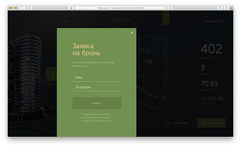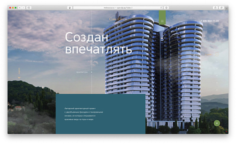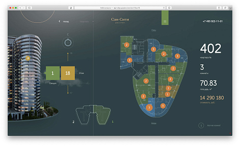 Сайт оснащен CRM-модулем и удобными подбором квартир с возможностью выбора по фасадам или по параметрам.