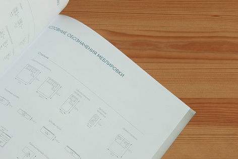 Например, разработана собственная стилистика отрисовки мебели и даже своеобразный гайд на последнем развороте, позволяющий клиенту представить себе будущую квартиру в точных измерениях.