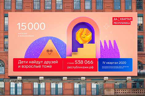 При этом у каждого саб-бренда есть и элементы собственной идентичности. Например, «Да.Квартал. Республика» активно использует графику в стиле парейдолических иллюзий (парейдолия — склонность человека выявлять знакомые образы и различать лица в неодухотворенных предметах). Так на свет появились геометрические персонажи-эмодзи, поддерживающие и дополняющие характер саб-бренда и способные решать широкий спектр маркетинговых задач — от акциденции и навигации до полноценных сюжетных иллюстраций.