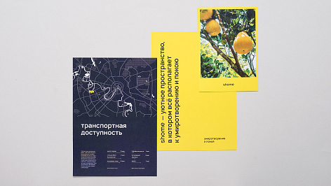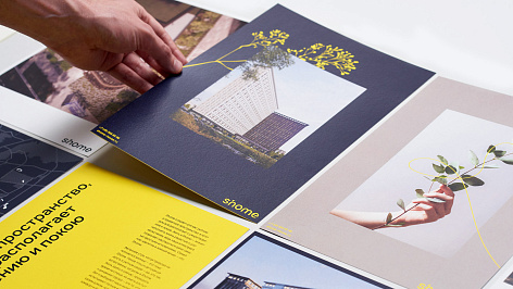 Главная идея бренда Shome — семейное благополучие в природном окружении. Позиционирование строится на центральной роли дома в формуле человеческого счастья. Визуальный язык бренда использует образы, связанные с комфортом, уютом и природой. Буклет как один из рекламных носителей поддерживает главное сообщение бренда («природа благополучия») и помогает найти рациональные и эмоциональные доводы купить квартиру в ЖК Shome.
