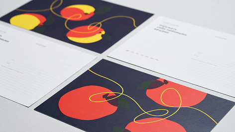 На карточках — не только факты и описание рациональных преимуществ проекта. Часть из них представляют собой подарочные открытки с лаконичными секретами счастья. Их дизайн использует яркие, по природному насыщенные образы: графические и фотоизображения фруктов и сухоцветов создают радостное настроение и отлично транслируют идею бренда. Еще один набор карточек содержит интересные факты из исследования датских ученых о счастье и месте дома в нем.