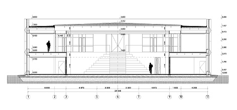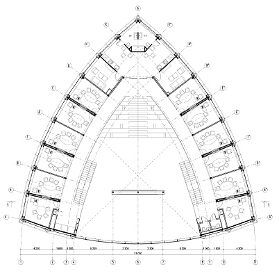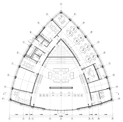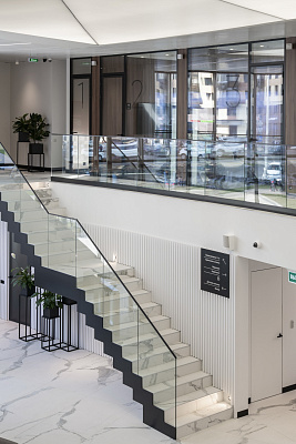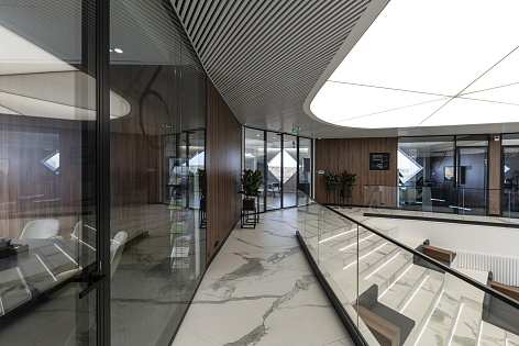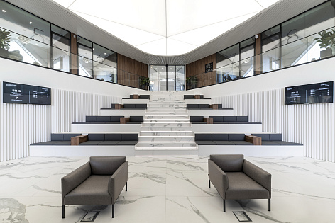 Ядром здания является двухсветный амфитеатр, объединяющий переговорные зоны и места ожидания для клиентов.