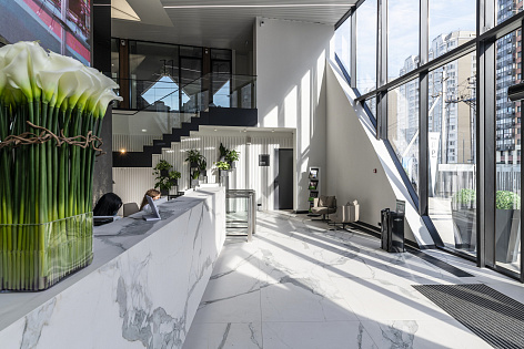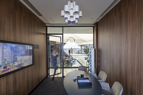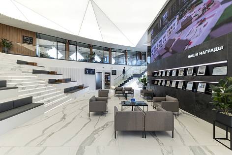 Офис продаж должен был обеспечивать клиентам компании комфортную покупку объектов недвижимости. Для решения этой задачи требовалось грамотное зонирование пространства офиса: эргономика переговорных комнат, общих зон, комнат отдыха формируют чёткое понимание клиентом продукта и уровня сервиса компании. Для решения этой задачи в успешных интерьерах офиса продаж были реализованы digital-технологии, демонстрирующие ключевые преимущества продаваемого объекта (полномасштабные экраны, кинотеатр 360, тач-столы, интерактивные консультационные панели менеджеров по продажам), а также интегрированы шоу-румы квартир наглядно презентующие материалы отделки.
