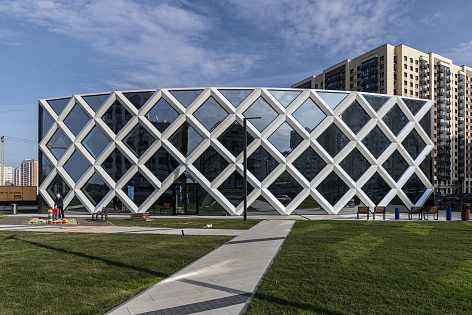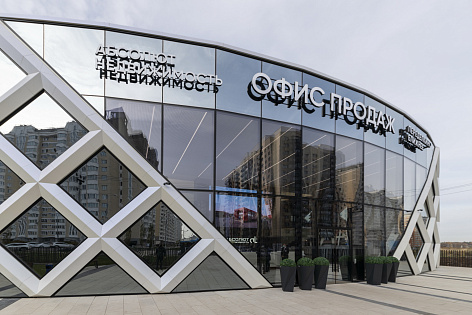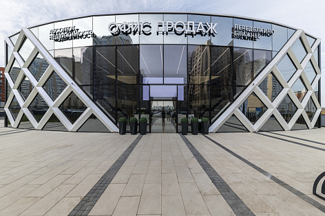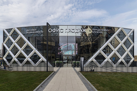 Компания «Абсолют Недвижимость» предлагает довольно много разноформатного жилья в районе Переделкино. Поэтому офис продаж для ЖК «Переделкино Ближнее» должен был уверенно представить узнаваемый бренд застройщика, став при этом особым центром притяжения для района. Этой цели удалось достичь за счет запоминающегося образа здания и его структурной ромбовой сетки в качестве акцента.