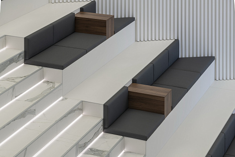• Зона ожидания в формате амфитеатра, центральным элементом которого является медиаэкран, что создаёт атмосферу кинотеатра. Зона ожидания включает в себя медиазал, где в формате 360 демонстрируется иммерсионный контент о проекте. Уютный кофе-поинт, детская комната и оригинальный стеллаж с наградами поддерживают имидж клиентоориентированной компании;