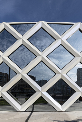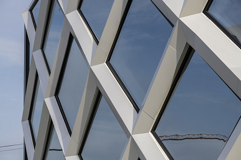 Основа композиции объекта – треугольный двухэтажный объем, фасад которого выполнен в единой структурной сетке из витражей в форме ромба и композитных панелей перламутрового цвета.