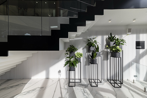 Основная авторская идея архитекторов – разработать офисное здание, которое соответствует архитектурной среде. Эта задача была решена треугольной планировкой. Структурная сетка фасада придает зданию офиса продаж органичный единый объем, скрывая внутреннюю структуру. Вот почему при своей немалой площади реализованный объект выглядит довольно компактным. Ядром здания является двухсветное пространство, в котором расположены зоны ожидания, reception, демонстрационные экраны и переговорные зоны.