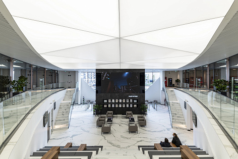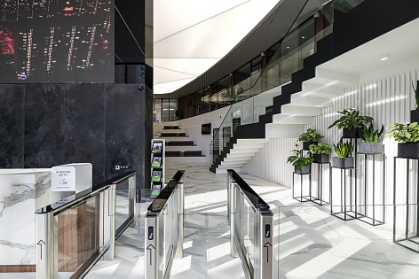 Главный вход в офис ориентирован на центральный бульвар панорамным остеклением, за которым размещена огромная медиа-панель.
