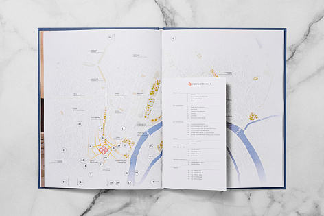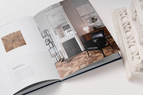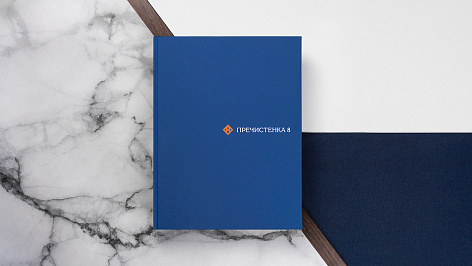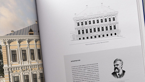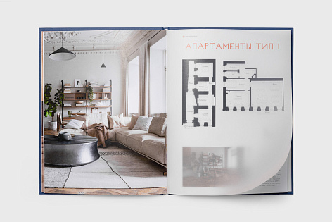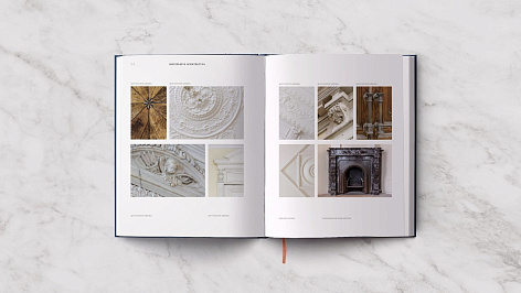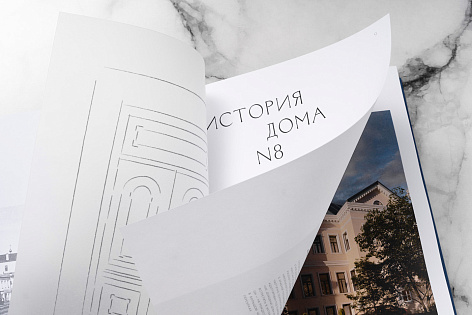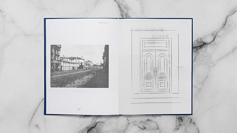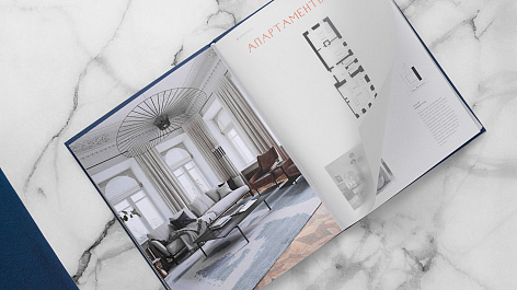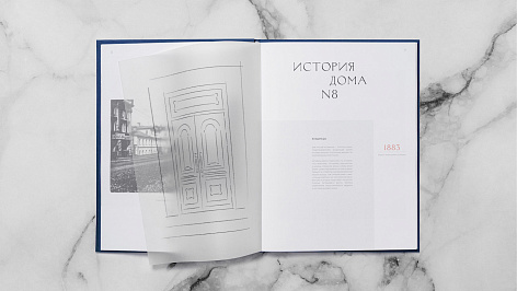 Обложка буклета выполнена в монохромном глубоком синем цвете, подчеркивающем статус проекта. Акцент в виде яркого, но изящного логотипа раскрывает историческую архитектурную ценность и изысканность объекта. В буклете появляются кальки со скетчевыми рисунками от руки, которые лаконично обрамляют описание восстановления архитектурных деталей вручную. А эстетику дома деликатно отражают подобранные рукописные шрифты.