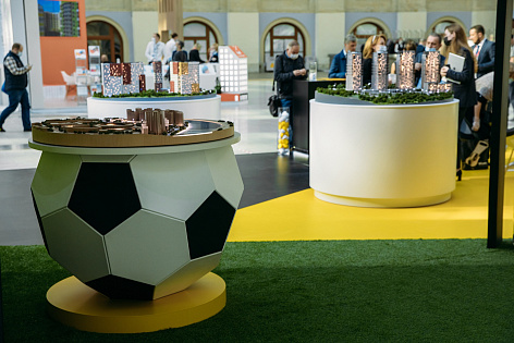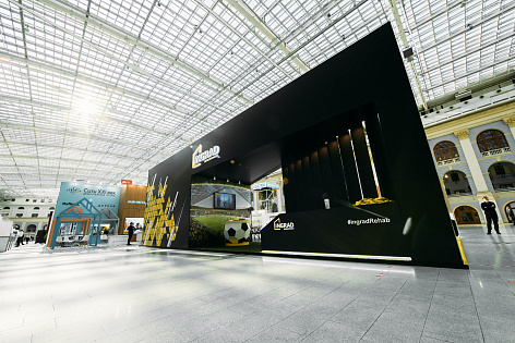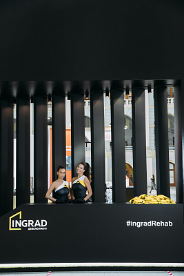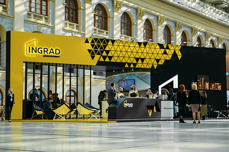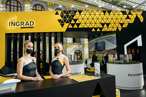 Дизайн-концепция стенда была создана по бренд-гайдлайнам INGRAD, в основе которой черный и желтый цвета. Геометрия пространства складывалась из треугольных форм, которые прослеживались не только в архитектуре самого стенда, но и в деталях интерьера.