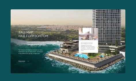 В комплексе продуманная до мелочей инфраструктура, которая позволяет закрывать все потребности клиентов. Нашей задачей было показать это. Для удобства покупателя продумали структуру сайта, реализовали удобную навигацию по апартаментам и подчеркнули инфраструктуру комплекса.