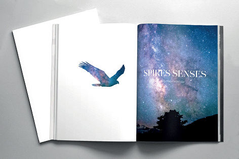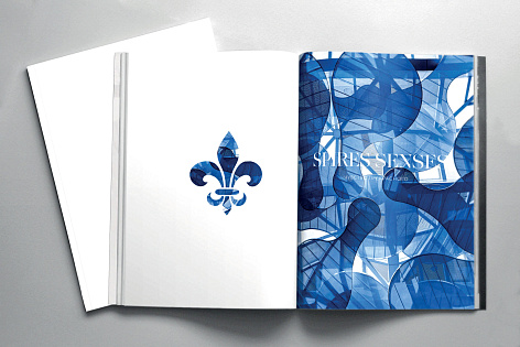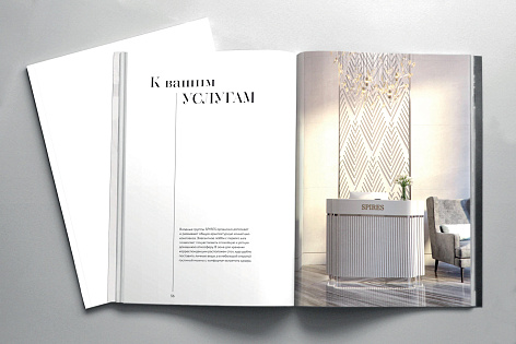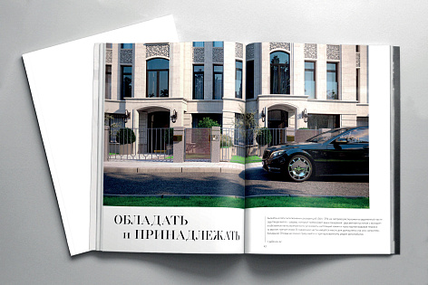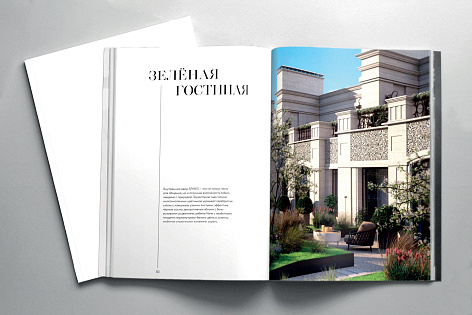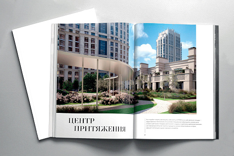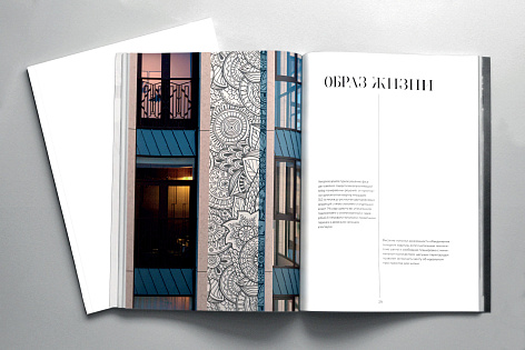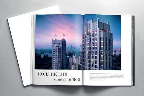 Каждый раздел предваряет имиджевый шмуцтитул, соответствующий тематике блока. В буклете использована вертикальна ассиметричная верстка с крупными заголовками, набранными прописными и строчными буквами. Заголовки визуально объединены с текстовыми блоками тонкими вертикальными линиями. Такой прием «вытягивает» полосу, делает общую композицию лёгкой, но при этом монументальной и отсылает к архитектурной стилистике проекта – неоклассика с элементами ар-деко.