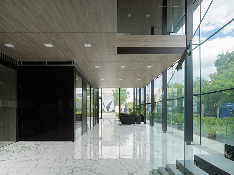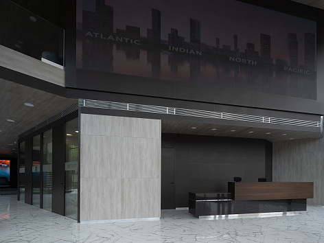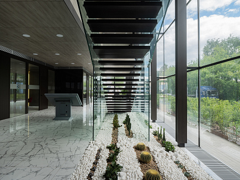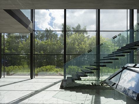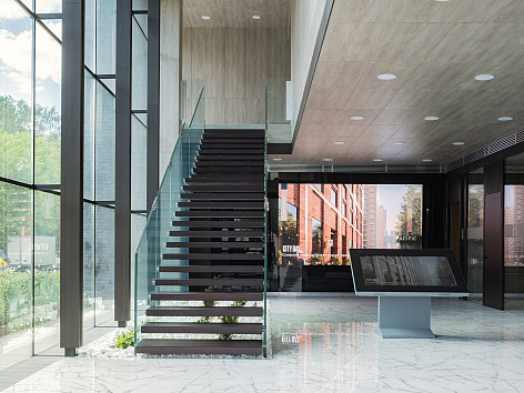 Интерьер здания выполнен в сдержанных тонах: пол цвета белого мрамора, стены – частично серые, частично – цвете темно-тонированного венге. Входная зона, зона ожидания и зона расположения макета имеет потолок высотой 8 метров и панорамное остекление, ориентированное в сторону залива. Офис словно наполнен воздухом. Чтобы это ощущение поддержать – лестница на второй этаж выполнена из стекла, у нее нет ни титив, ни косоура – только ступени из дуба, зажатые вдоль двух стеклянных пластин. Фантастический эффект парящих ступеней.