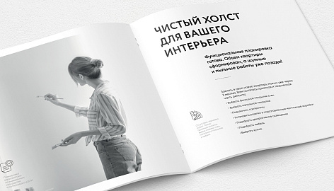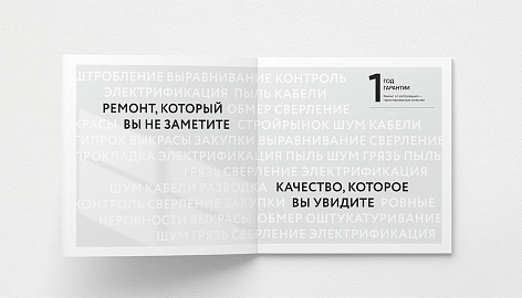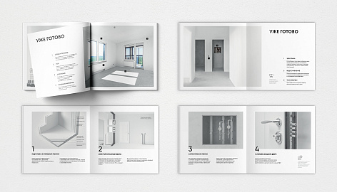 Полиграфическое исполнение подчеркивает идею отделки, будучи выполненным с использованием тактильных дизайнерских бумаг.