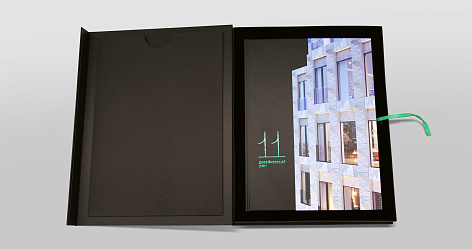 Лимитированное издание выполнено в твердом переплете. На обложке — крупный план фасада с авторским рисунком архитекторов бюро «Меганом» и логотип «11», тисненый изумрудной фольгой. Издание вкладывается в короб с бархатным ложементом, на верхней части короба слоган проекта — «Главное внутри». Книга легко вынимается из короба с помощью атласного ляссе цвета логотипа. С внутренней стороны короба вклеена папка для планировочных решений. Все, что нужно тебе, находится внутри коробки, просто открой…