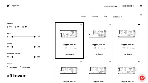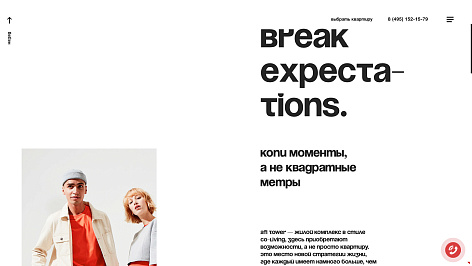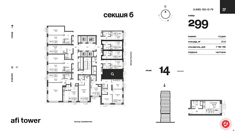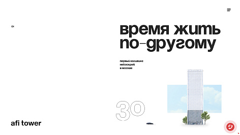 Благодаря интерактивным технологиям сайтостроения (html5, ccs3, vue.js) у нас была возможность сделать эффектную анимационную презентацию – ведь для краткого знакомства с AFI TOWER вам всего лишь нужно совершить виртуальный «облёт» с главной страницы, использую всего лишь одну кнопку – «ВПРАВО». Ну а все подробности главных страниц-разделов скрыты под «скроллом» – в виде интеракитвных лендингов.