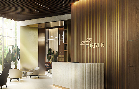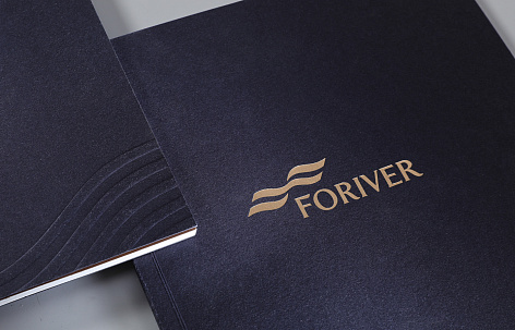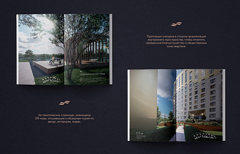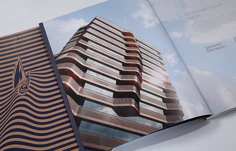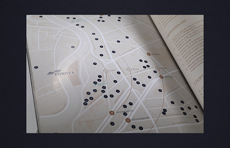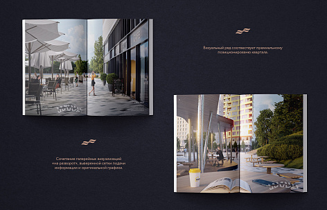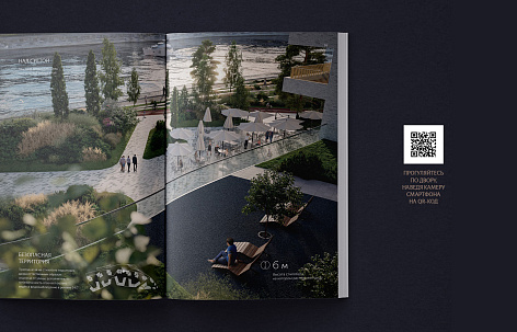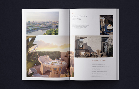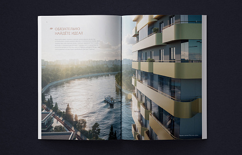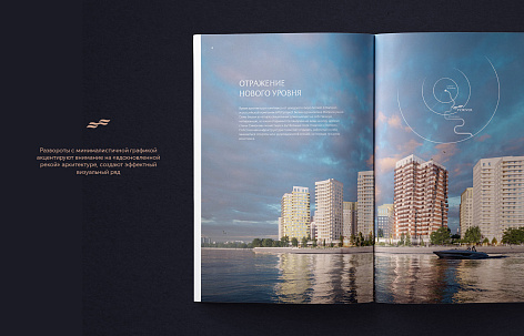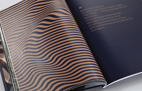 Эффектная полиграфия с комбинацией премиальных материалов и методов послепечатной обработки. Сочетание галерейных визуализаций «на разворот» и выверенной сетки подачи информации. Развороты с минималистичной графикой акцентируют внимание на «вдохновленной рекой» архитектуре, создают эффектный визуальный ряд.