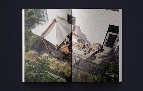 Сет атмосферных визуализаций, акцентирующих преимущества квартала, произведен специально для издания. Пропорция смещена в сторону визуализаций внутреннего пространства, чтобы отметить прекрасное благоустройство и общественные зоны квартала. Сочетание 3D и панорамной сьемки призвано впечатлить потенциального клиента.