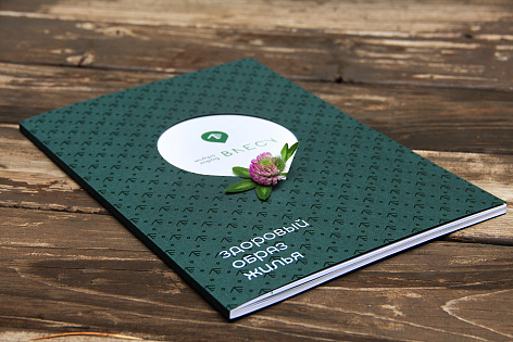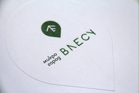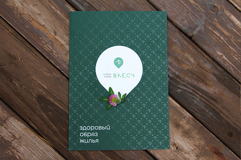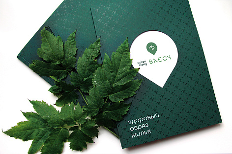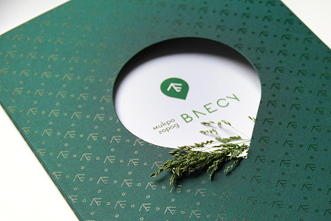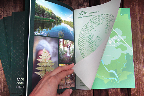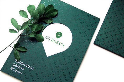Обложка буклета поддерживает название проекта Микрогород «В лесу» и состоит из основной части, олицетворяющей лес (фирменный паттерн), и второй обложки-вставки с логотипом, поднятым конгревом, который «выглядывает из-за деревьев».
