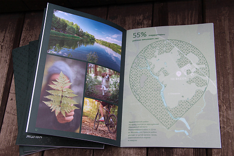 Используем сочные эмоциональные фотографии зеленого окружения комплекса, которые приобретают натуральные природные оттенки за счет печати на офсетной бумаге. Наряду с природной темой показываем рендеры в ракурсах, выгодно подсвечивающих масштабность микрорайона, и фотографии, демонстрирующие жизнь микрогорожан в уже сданных очередях и свидетельствующие о том, что в микрорайоне уже сформировалось полноценное комьюнити.