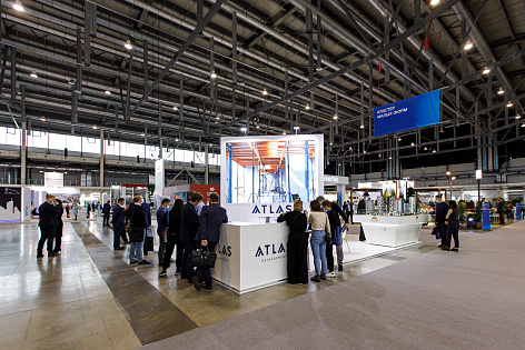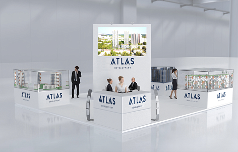 Стенд компании «Атлас Девелопмент» на форуме 100+ TechnoBuild был выполнен в правильной квадратной форме. По краям располагались макеты флагманских объектов компании «Парк Столиц», iTower, «Логопарк Кольцовский» и жилая экосистема 4YOU. Центральное место было отведено под зону переговоров. Гостей стенда угощали вкусным кофе. Для наглядной презентации инженерных и архитектурных решений, а также визуального сопровождения стенда был использован медиаэкран с трансляцией имиджевых роликов компании.