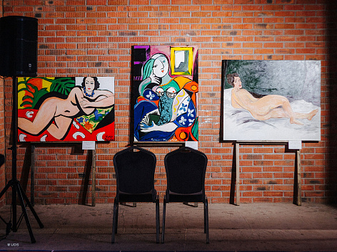 Вечер завершился выставкой картин. Авторская трактовка привычной классики - Анри Матисса, Пабло Пикассо, Амедео Модильяни в современном прочтении была тепло принята гостями вернисажа. На благотворительном аукционе, было продано 8 картин, вырученные деньги переданы в благотворительный фонд. Еще 5 картин купили на следующий день.