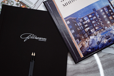 Для обложки буклета используется тканевый покрывной материал TEXTILE IMPERIAL black с двойным фольгированием и тиснением. Чтобы подчеркнуть авторское исполнение, были отрисованы скетчи. Уникальные фотографии вечерней Казани были отсняты специально для буклета, их главная задача — передать прекрасные видовые характеристики и подчеркнуть преимущества локации.