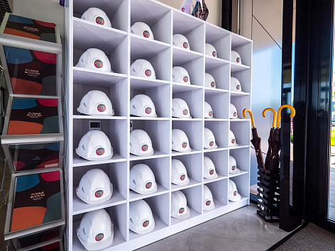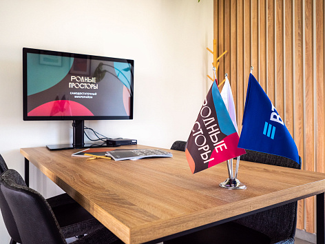 Множество деталей в офисе продаж выполнены в фирменном стиле МКР: брендированный текстиль, строительные каски, флаги, картины с изображением микрорайона, часы, посуда, полиграфия – все элементы и детали продуманы до мелочей, офис словно наполнен воздухом и пропитан атмосферой объекта.