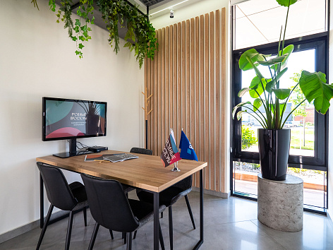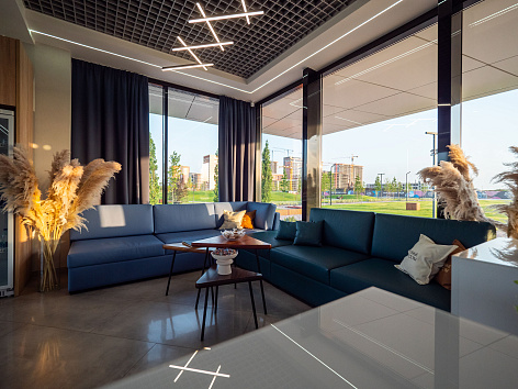 Входная группа выполнена из керамогранита под дерево, за зоной ресепшен – эко-стена из стабилизированного мха, использованы мультифункциональные стеклопакеты в темном алюминиевом профиле. Перегородки в переговорных комнатах полностью прозрачные. Витражное остекление позволяет наслаждаться видом на парк и наблюдать динамику строительства микрорайона.