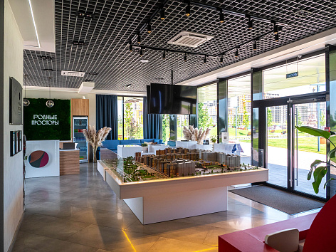 Офис продаж расположен на территории парка семейного отдыха «Родные Просторы», который является частью строящегося микрорайона. От одела продаж до домов комплекса можно дойти пешком, прогуливаясь по аллеям, или доехать на фирменном гольфкаре.