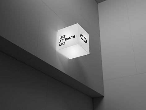 Для английской адаптации была выбрана совпадающая по смыслу идиома «Like attracts like» – в ней два «like» на концах слогана притягивают друг друга, создавая визуальную рифму с конструкцией логотипа.